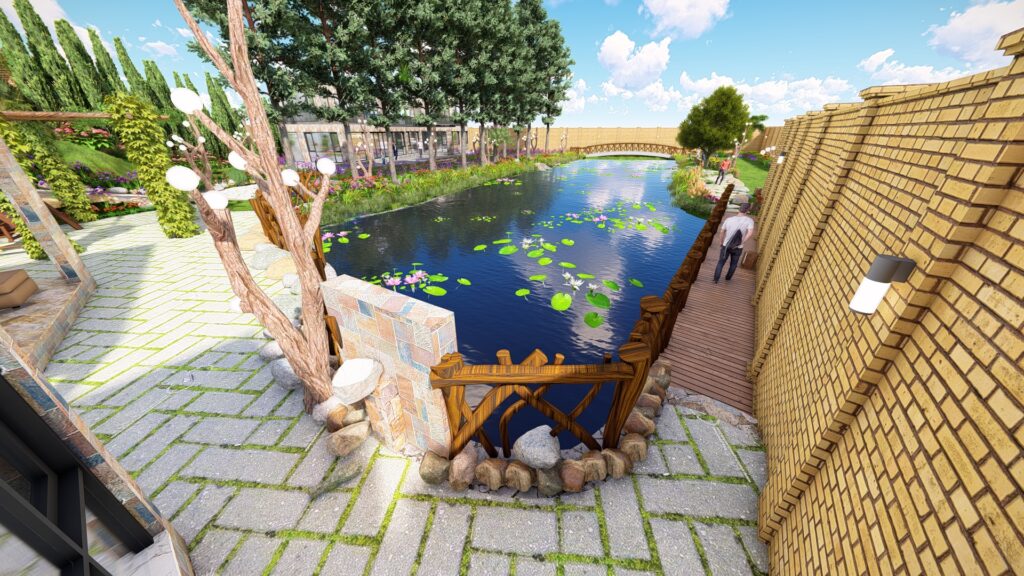 - Tiểu cảnh giếng nước: Phía đối diện, giếng nước hiện trạng được giữ lại, cải tạo và quy hoạch thành một tiểu cảnh sân vườn mang đậm nét hoài cổ. Xung quanh giếng cũng được bố trí cây xanh tương tự, tạo nên sự đồng điệu và hài hòa cho toàn bộ khu vực.