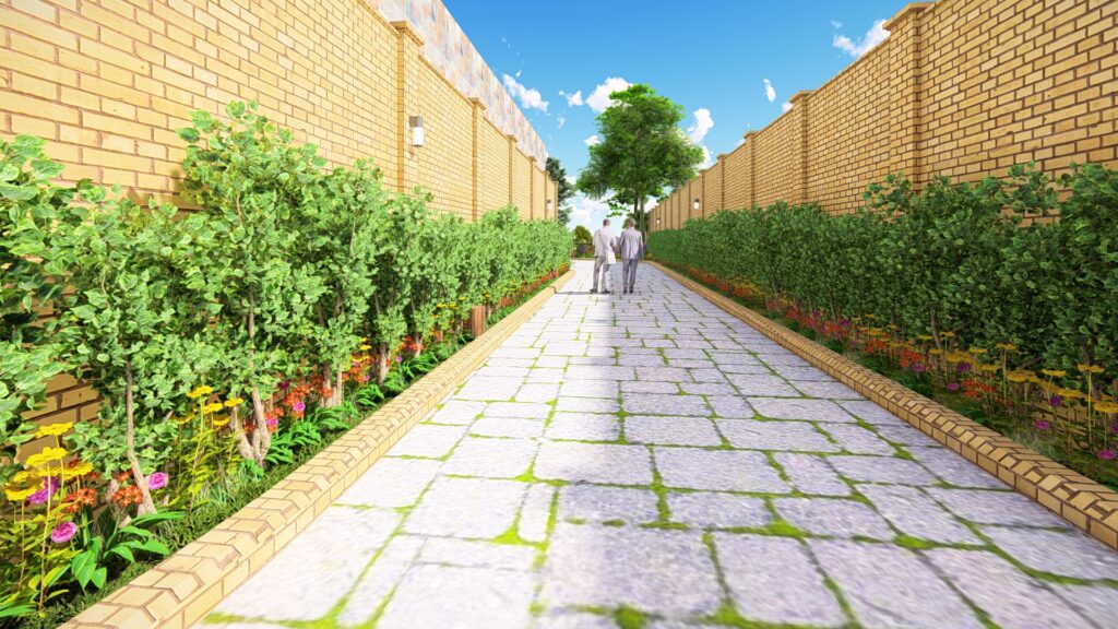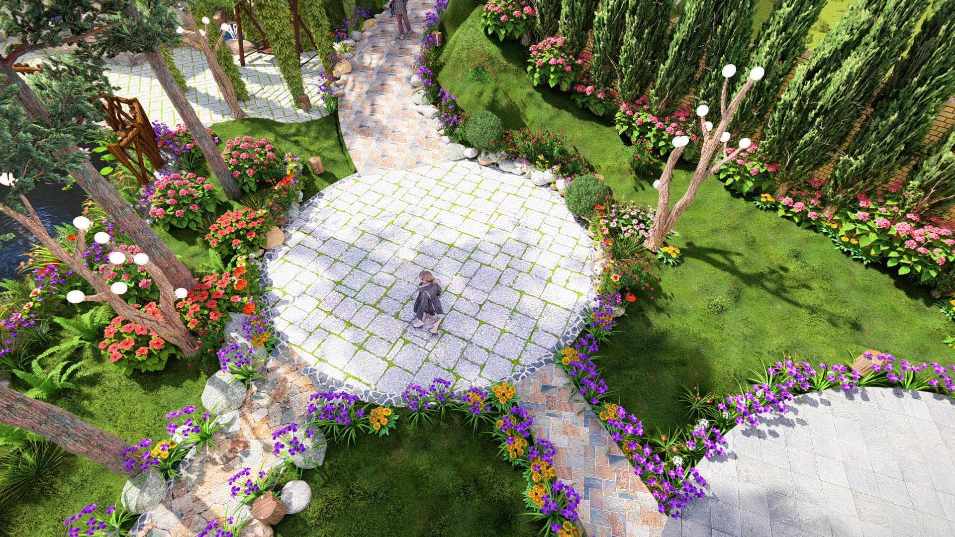 Lối vào và đường dạo: Ngay sau cổng chính là con đường dẫn vào khu đất, hai bên được viền bởi những hàng cây hoa bụi thấp nhiều màu sắc. Lối thiết kế này vừa tạo sự riêng tư, vừa mở ra một hành trình khám phá đầy thú vị.
