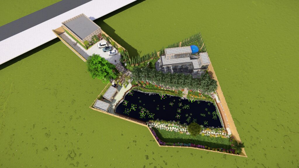 Nhà ở và View hồ nước: Ngôi nhà được đặt ở vị trí trung tâm, với tầm nhìn trọn vẹn ra một hồ nước lớn trong xanh. Đây là một lợi thế vô giá mà bản thiết kế cảnh quan sân vườn đã khai thác triệt để.