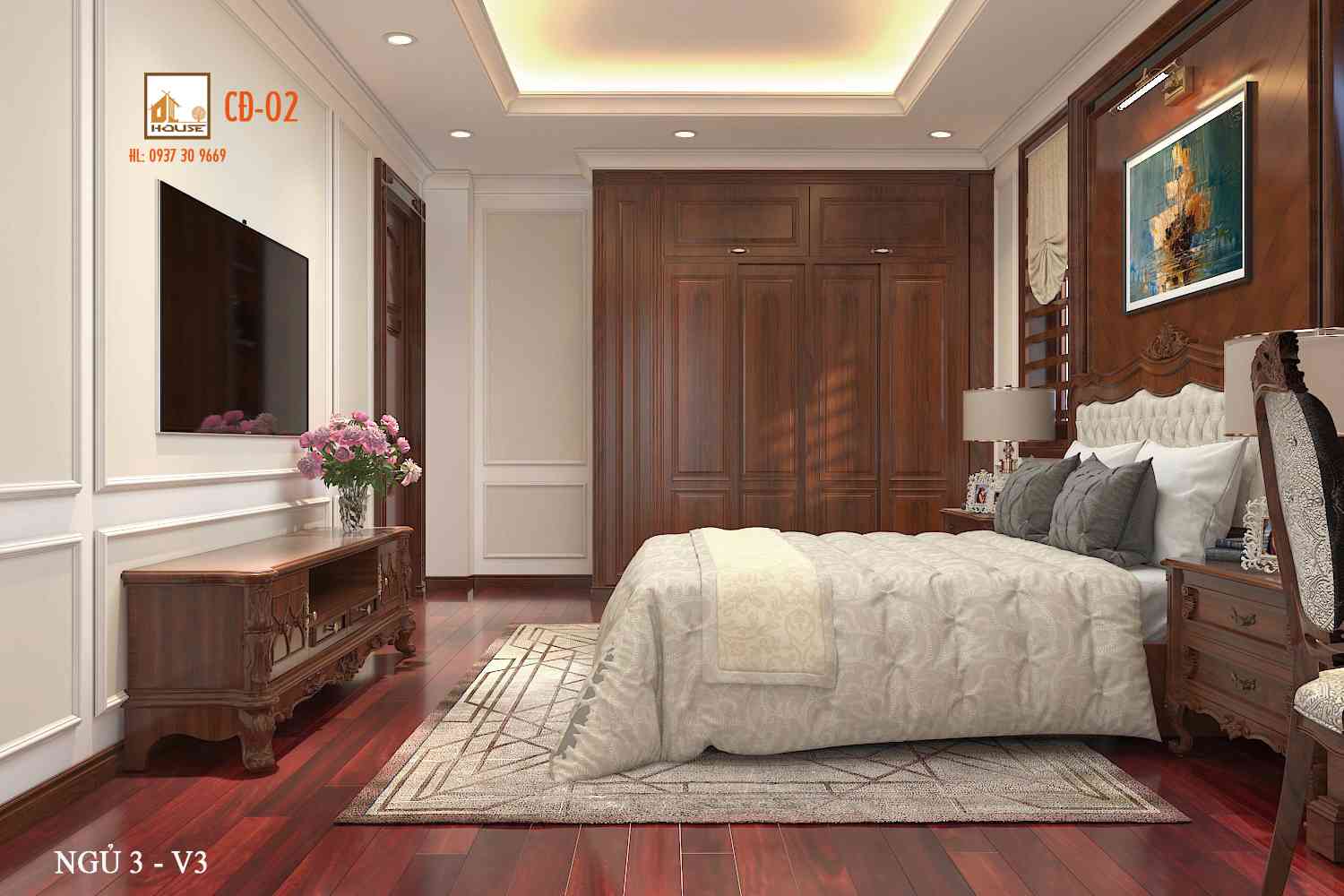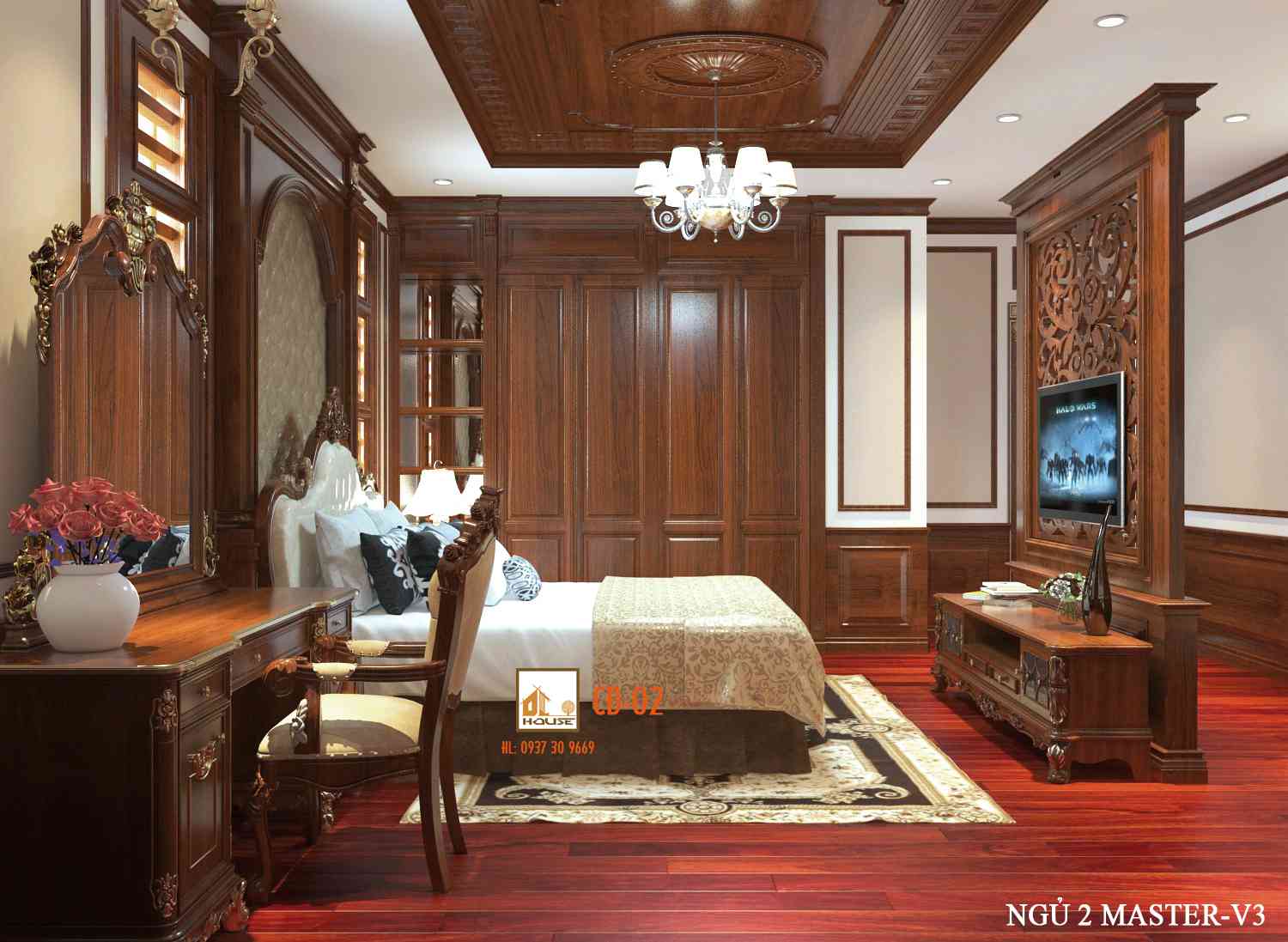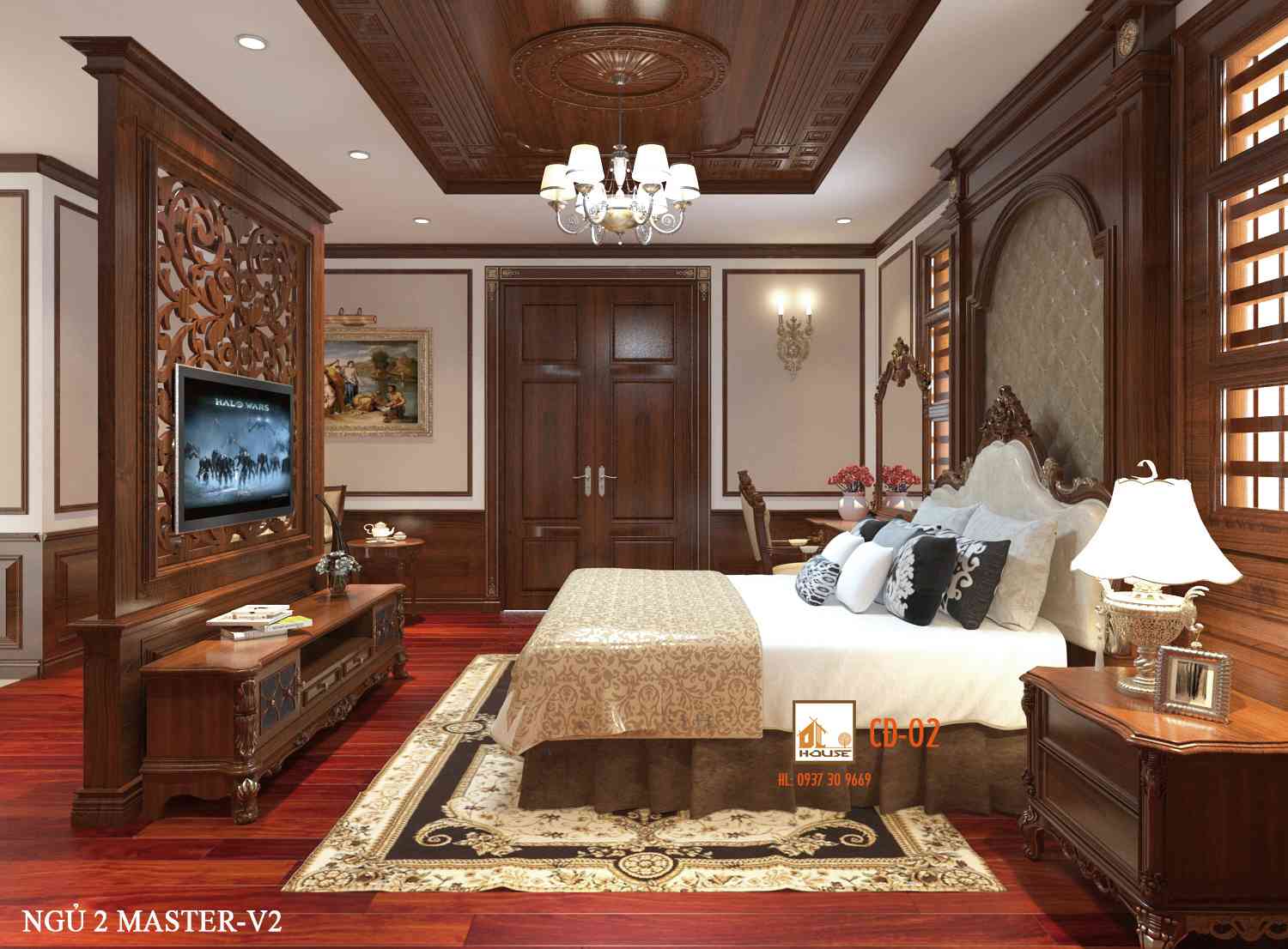 Vách Bình Phong Đa Năng: Trong phòng còn được bố trí các tấm vách bình phong ngăn cách giữa giường ngủ và các không gian phụ khác. Trên vách bình phong này được treo tivi, dưới là kệ tủ tivi. Tất cả được hòa hợp với nhau bởi chung một vật liệu gỗ và cách điêu khắc chi tiết trên từng thiết bị nội thất này. Tạo nên một tổng thể hài hòa và công năng.