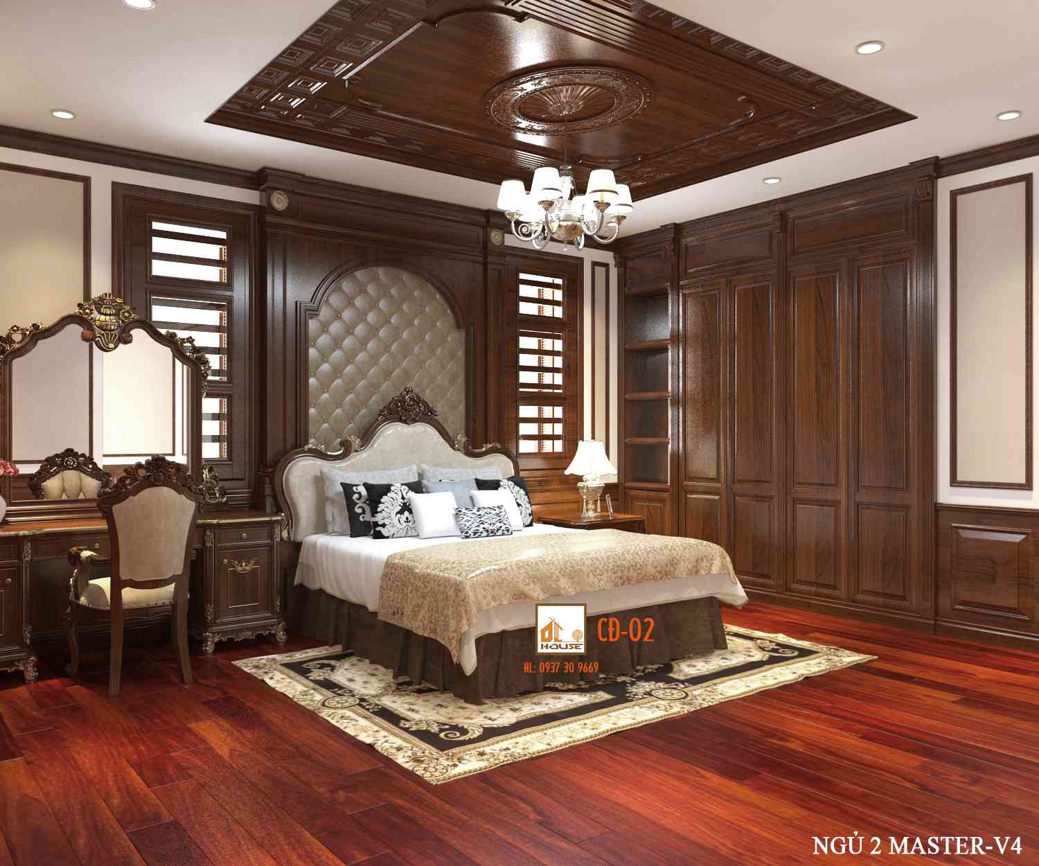 Sàn Gỗ Tự Nhiên và Nội Thất Điêu Khắc Tinh Xảo: Sàn được lát gỗ tự nhiên, mang lại sự ấm áp. Các thiết bị nội thất như bàn trang điểm. Tủ đầu giường đều được làm theo phong cách điêu khắc hoa văn cổ điển và kết hợp dát vàng trên hoa văn. Ốp nỉ ở ghế trang điểm, ốp da đầu giường, tạo vẻ nguy nga, sang trọng, lộng lẫy cho căn phòng. Đây chính là minh chứng cho việc sử dụng đồ nội thất lâu đài cao cấp.