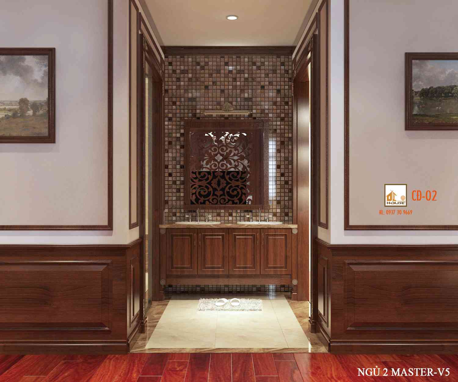 Tường Ốp Gỗ và Giấy Dán Tường: Các mảng tường được ốp gỗ tự nhiên và ốp phào tạo ô vuông trên tường. Lòng trong của các ô vuông được dán giấy dán tường với hoa văn tinh tế. Tất cả cổ trần với tường đều được chạy phào chỉ gỗ tự nhiên, tạo sự liền mạch trong phong cách.