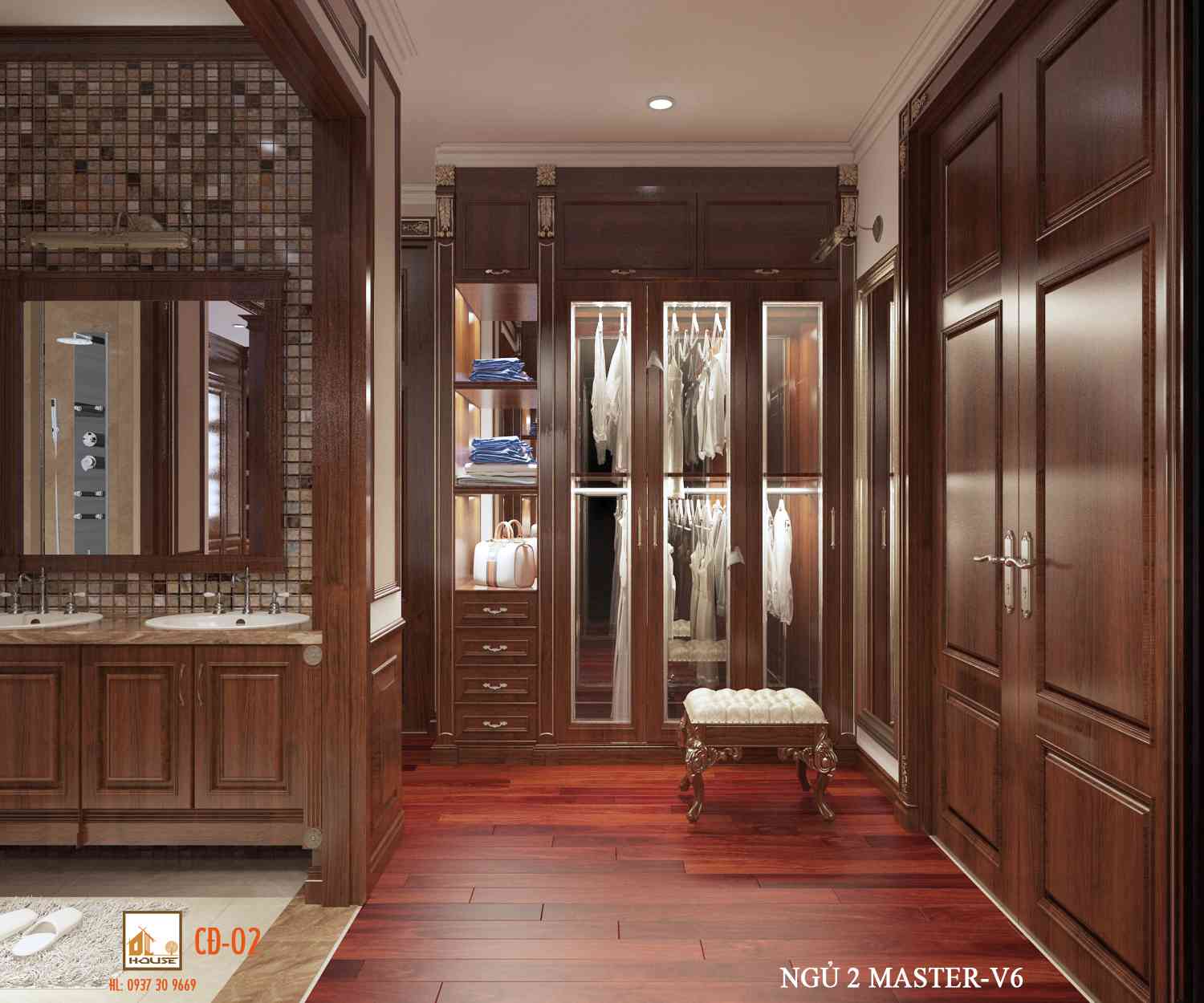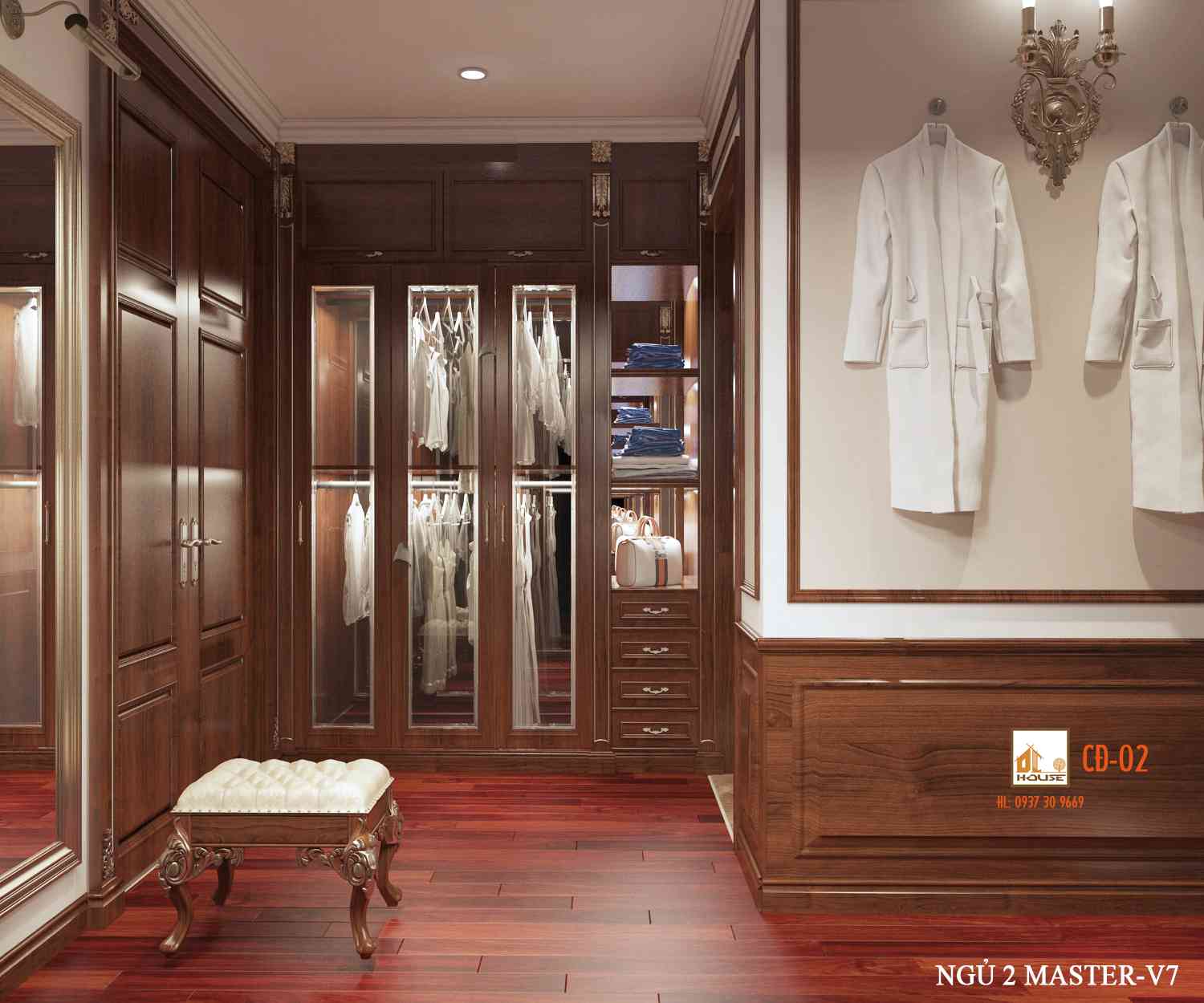 Tủ Quần Áo Cánh Kính: Khu thay đồ có các tủ quần áo được làm các cánh pano kính kết hợp gỗ. Tạo nên sự tinh xảo và sang trọng. Đồng thời giúp gia chủ dễ dàng tìm kiếm trang phục.