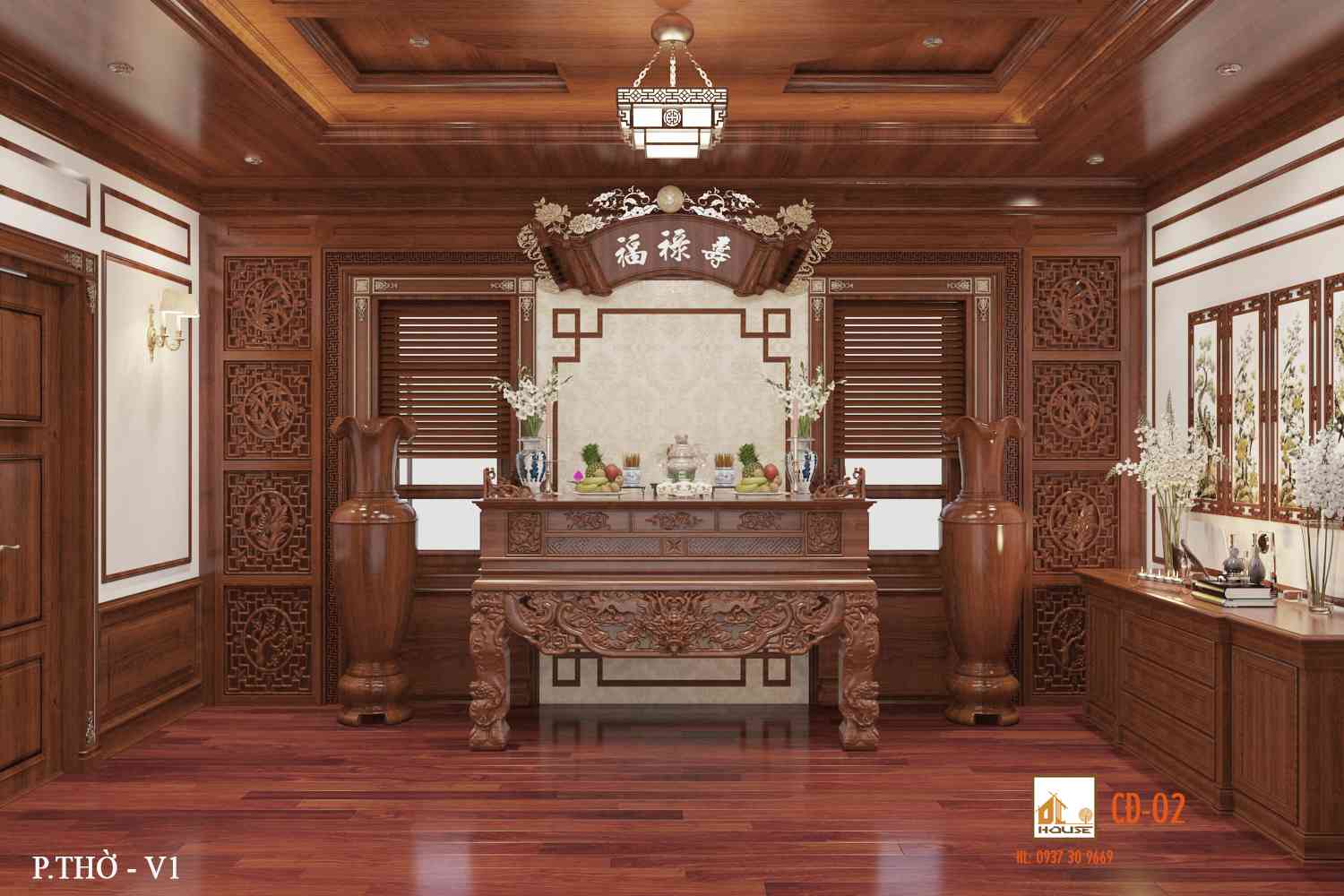 Ốp Gỗ Quý Toàn Diện: Không gian phòng thờ được ốp full gỗ quý tự nhiên màu cánh gián. Tạo nên một vẻ đẹp cổ kính, trang trọng và linh thiêng.