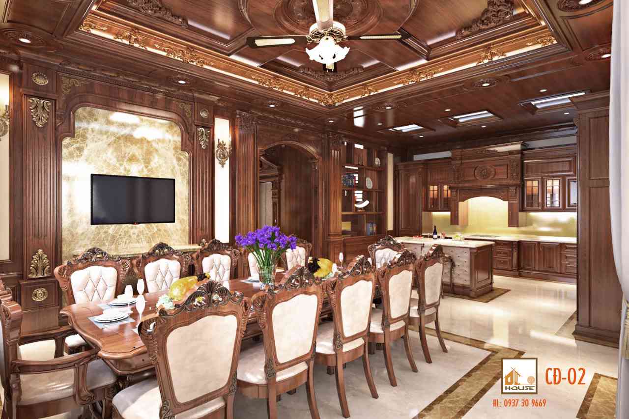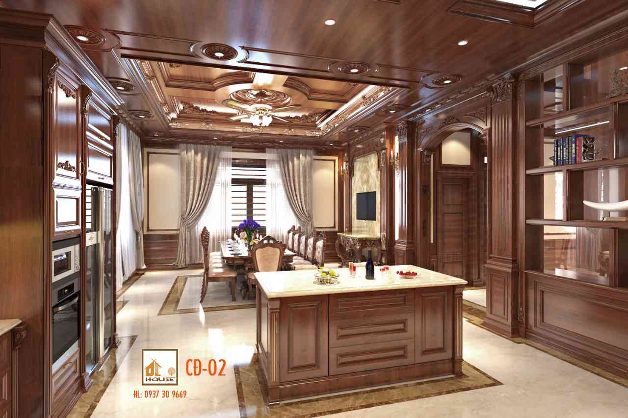 Đảo Bar và Bàn Ăn Điêu Khắc Tinh Xảo: Đảo bar và bộ bàn ghế bàn ăn đều được đóng theo kiểu điêu khắc cổ điển với hoa văn trang trí tinh xảo. Đặc biệt, các chi tiết này được dát vàng làm điểm nhấn, tăng thêm sự xa hoa và đẳng cấp cho khu vực ăn uống.