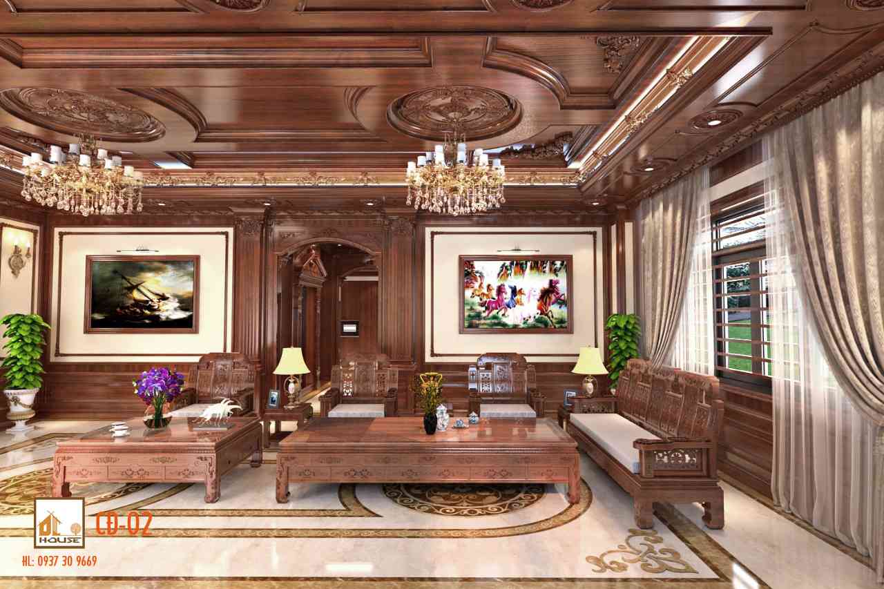 Trần phòng khách được ốp hoàn toàn bằng gỗ tự nhiên màu cánh gián. Chia làm hai cấp, tạo chiều sâu và sự ấm cúng. Xung quanh mặt trần của cả hai cấp đều được bắn phào trang trí. Khắc hoa văn phù điêu gỗ tinh xảo. Thể hiện tay nghề thủ công điêu luyện. Đèn downlight được gắn xung quanh trần, cung cấp ánh sáng nền dịu nhẹ.